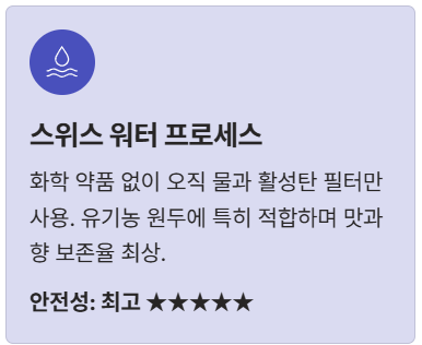 | 1. 스위스 워터 프로세스 (SWP) | 화학 약품 없이 오직 물과 활성탄 필터만 사용. 유기농 원두에 특히 적합하며 맛과 향 보존율 최상. | 매우 안전(최고), 맛 우수 |
