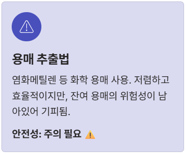 | 3. 용매 추출법 (화학 용매) | 염화메틸렌(MC) 등 화학 용매 사용. 저렴하고 효율적이지만, 잔여 용매의 위험성이 남아있어 기피됨. | 주의 필요, 맛 손실 큼 |