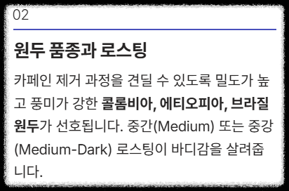 길고 복잡한 내용, 딱 세 가지만 기억하시면 됩니다. 오늘부터 맛과 안전성 모두 챙긴 프리미엄 디카페인 생활을 시작해 보세요!