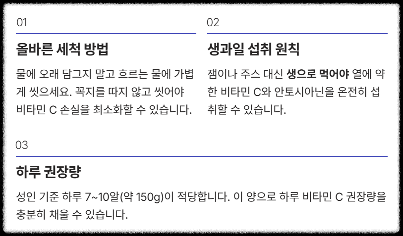 - 하루 권장량: 성인 기준 하루 7~10알(약 150g) 정도가 적당합니다. 이 양으로 하루 비타민 C 권장량을 충분히 채울 수 있습니다.