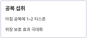 - ✅ 공복 섭취: 아침 공복에 1~2 티스푼을 섭취하면 위장 보호 효과를 극대화할 수 있습니다.