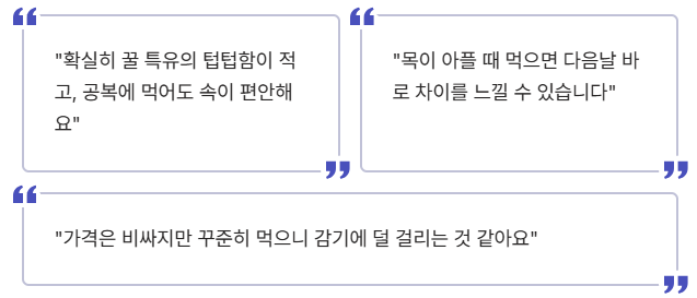 실제 사용자 후기들을 보면, "확실히 꿀 특유의 텁텁함이 적고, 공복에 먹어도 속이 편안하다"는 의견이 많습니다. 꾸준히 섭취하신다면 분명 기대 이상의 긍정적인 변화를 느끼실 수 있을 거예요.