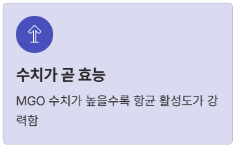 - MGO란? 마누카 꽃에서 채취한 꿀 속에 자연적으로 생성되는 화합물로, 강력한 항균 작용을 하는 핵심 성분입니다. MGO 수치가 높을수록 항균 활성도가 높다고 해석할 수 있습니다.