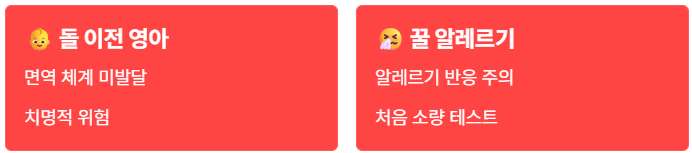 - 절대 금지: 돌 이전의 영아에게는 절대 먹이지 마세요. 뜨거운 물도 피하세요!