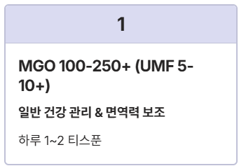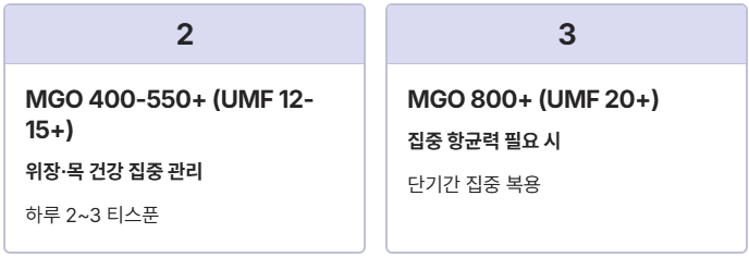 - 등급 확인: 일반적인 건강 관리는 MGO 100~250+, 위장 건강 등 특정 목적은 MGO 400+ 이상을 선택하세요.