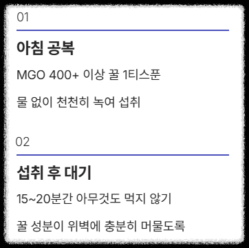 - 1단계 (공복): 아침 공복에 MGO 400+ 이상 꿀 1티스푼을 물 없이 꿀 그대로 천천히 녹여 섭취합니다.