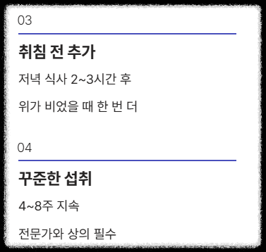 - 2단계 (취침 전): 저녁 식사 후 2~3시간이 지나 위가 비었을 때 한 번 더 섭취합니다.