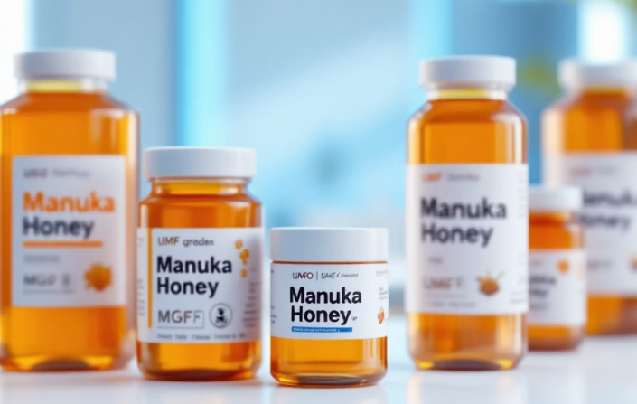 (이미지 대체 텍스트: 다양한 MGO, UMF 등급이 표시된 마누카꿀병들이 나열된 모습. 등급별 복용량의 중요성을 강조)