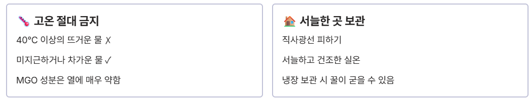 - 고온 금지: MGO와 같은 활성 성분은 열에 약합니다. 40°C 이상의 뜨거운 물이나 음료에 섞어 마시는 것은 절대 피해야 합니다. 미지근하거나 차가운 물이 좋습니다.