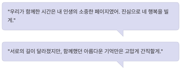 - "우리가 함께한 시간은 내 인생의 소중한 페이지였어. 진심으로 네 행복을 빌게."