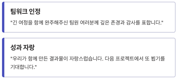 - "우리가 함께 만든 결과물이 자랑스럽습니다. 다음 프로젝트에서 또 뵙기를 기대합니다."