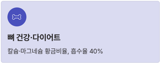 - 뼈 건강 및 다이어트: 칼슘과 마그네슘의 황금 비율로 흡수율이 40%에 달하며, 풍부한 포만감으로 혈당 상승을 억제합니다.