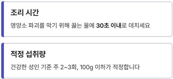 - 조리 시간: 영양소 파괴를 막기 위해 끓는 물에 30초 이내로 데치는 것이 핵심입니다.