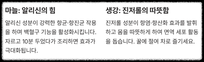**실제 후기/섭취 팁:** 저는 겨울에 생강차를 하루 한 잔 꼭 마시는데, 확실히 목감기가 덜 걸리더라고요. 생강을 편으로 썰어 꿀에 절여 두면 손쉽게 차로 마실 수 있고, 닭고기 요리나 국물 요리에 약간씩 넣어 풍미를 더하는 것도 좋은 방법이에요.