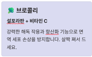 **과학적 근거:** 브로콜리는 **비타민 C**와 함께 강력한 해독 작용 및 **항산화** 기능을 하는 설포라판이 풍부합니다. 이 성분들은 체내 유해 물질을 제거하고 면역 세포의 손상을 막아 면역 반응을 최적화하는 데 기여합니다.