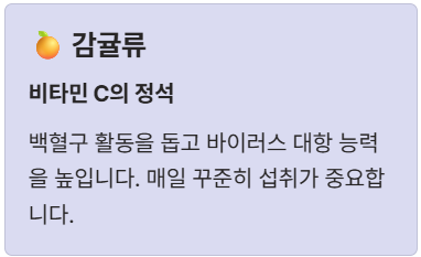 **과학적 근거:** 감귤류는 비타민 C의 상징이죠! 비타민 C는 면역 세포인 백혈구의 활동을 돕고, 강력한 **항산화** 작용으로 바이러스에 대항하는 능력을 높여줍니다. 면역력이 떨어질 때 가장 먼저 찾는 이유가 있답니다.