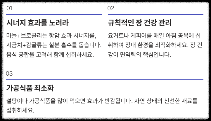 - 시너지 효과를 노려라: 마늘(알리신)과 브로콜리(설포라판)는 항암 효과 시너지를 내고, 시금치와 감귤류(비타민 C)는 철분 흡수를 돕습니다. 음식을 단독으로 먹기보다는 영양소 궁합을 고려해서 함께 섭취하세요.