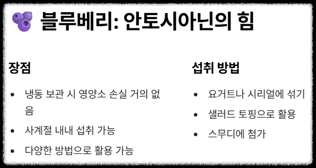 **과학적 근거:** 블루베리는 베리류 중에서도 특히 **항산화** 성분인 안토시아닌이 풍부합니다. 안토시아닌은 세포 손상을 일으키는 활성산소를 제거하여 전반적인 면역 기능을 개선하고 염증을 억제하는 데 도움을 주는 **슈퍼푸드**입니다.