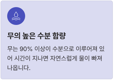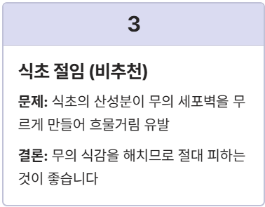 | 식초 절임 (비추천) | 식초의 산성분이 무의 세포벽을 무르게 만들어 흐물거림을 유발하고 텁텁한 맛이 생길 수 있음. | 무의 식감을 해치므로 절대 피하는 것이 좋습니다. |