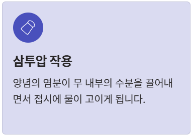 | 소금 + 설탕/물엿 동시 절임 | 삼투압 작용을 높여 수분은 빠르게 빼주고, 설탕/물엿이 무의 표면을 코팅하여 **세포벽을 보호**, 아삭함 극대화! | 가장 강력 추천! (20분~30분 절임 후 꽉 짜기) |