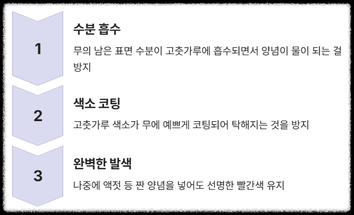 이렇게 하면 무의 남은 표면 수분이 고춧가루에 1차적으로 흡수되면서 **양념이 물이 되는 걸 방지**해줘요. 게다가 고춧가루 색소가 무에 예쁘게 코팅되면서 나중에 액젓이나 짠 양념을 넣어도 색이 탁해지는 걸 막아줍니다. 1석 2조의 효과인 거죠!