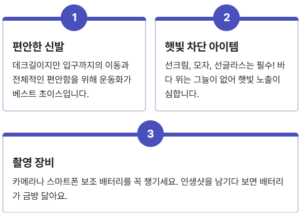 - 편안한 신발: 해상 데크길이지만, 입구까지의 이동과 전체적인 편안함을 위해 운동화가 좋습니다.