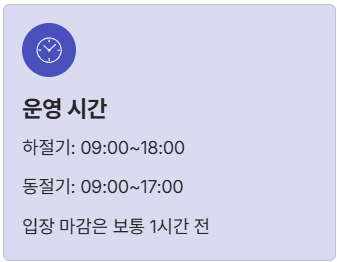 | **운영 시간 (하절기)** | 09:00 ~ 18:00 (입장 마감은 보통 17시까지) |