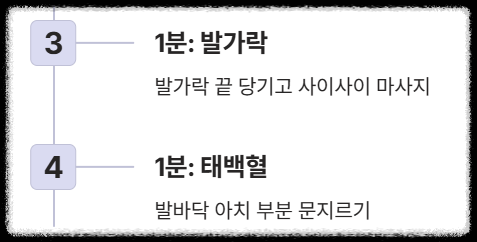 - 발가락 끝 자극 (1분): 발가락 끝을 하나씩 잡고 부드럽게 당겨주고, 발가락 사이사이도 마사지해줍니다. 이곳은 머리와 얼굴 관련 반사구가 몰려있습니다.
