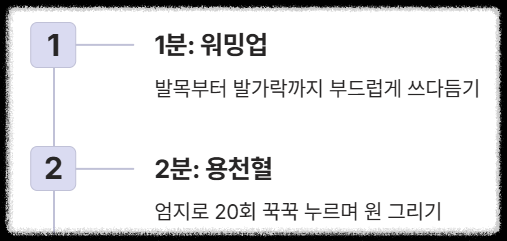 - 발 전체 워밍업 (1분): 양손으로 발을 감싸고 발목부터 발가락 끝까지 부드럽게 쓰다듬어 혈액순환을 돕습니다.