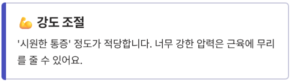 2. **강도 조절**: 너무 강한 통증은 오히려 근육에 무리를 줄 수 있습니다. '시원한 통증' 정도가 적당하며, 강도가 너무 세다면 줄이세요.