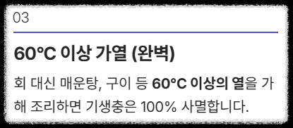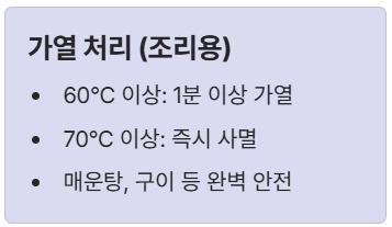 | 가열 처리 (조리용) | * 60°C 이상: 1분 이상 가열 * 70°C 이상: 즉시 사멸 | 매운탕, 구이 등으로 조리 시 완벽히 안전 |