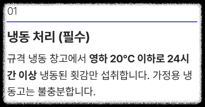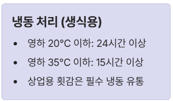 | 냉동 처리 (생식용) | * 영하 20°C 이하: 1일 (24시간) 이상 * 영하 35°C 이하: 15시간 이상 | 상업용 횟감은 필수적으로 냉동 유통됨 |