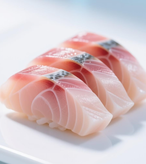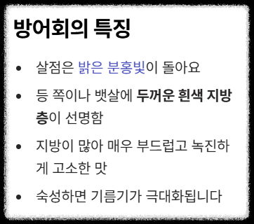 | 방어회 (Banga Hoe) | ① 살점은 밝은 분홍빛이 돌며, ② 등 쪽이나 뱃살에 두꺼운 흰색 지방층이 선명함. |
