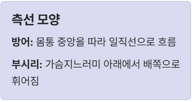 | ③ 측선 (Lateral Line) | 몸통 중앙을 따라 일직선으로 흐름 | 가슴지느러미 아래에서 배쪽으로 휘어짐 |