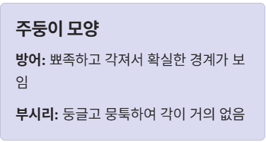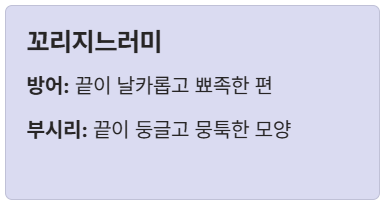 | ② 꼬리지느러미 | 끝이 날카롭고 뾰족한 편 | 끝이 둥글고 뭉툭한 모양 |