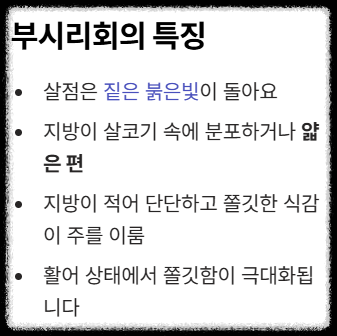 | 부시리회 (Booshiri Hoe) | ① 살점은 짙은 붉은빛이 돌며, ② 지방이 살코기 속에 분포하거나 얇은 편. |