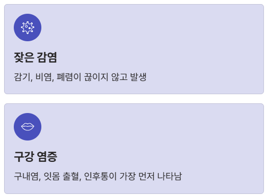 구강 점막은 우리 몸에서 세포 분열이 매우 활발한 곳입니다. 따라서 백혈구 수치가 낮아지면 구강 궤양(아프타성 구내염)이나 잇몸 출혈, 인후통 증상이 가장 먼저 나타나는 경향이 있습니다.