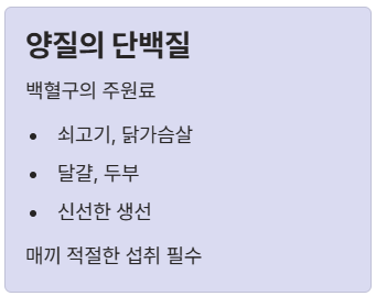 - 양질의 단백질: 백혈구의 주원료입니다. 쇠고기, 닭고기(가슴살), 달걀, 두부, 생선 등을 매끼 적절히 섭취해야 합니다.