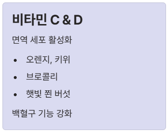 - 비타민 C & D: 비타민 C는 백혈구의 기능을 활성화하며, 비타민 D는 면역 세포의 생성을 조절합니다. 오렌지, 브로콜리, 등푸른 생선, 햇빛을 쬔 버섯 (UV노출, 비타민 D) 등이 좋습니다.