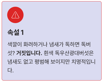 - **속설 1: 색깔이 화려하거나 냄새가 독하면 독버섯이다?** → 흰색 독버섯(독우산광대버섯)은 냄새도 없고 외형도 평범해 보이지만 치명적입니다.