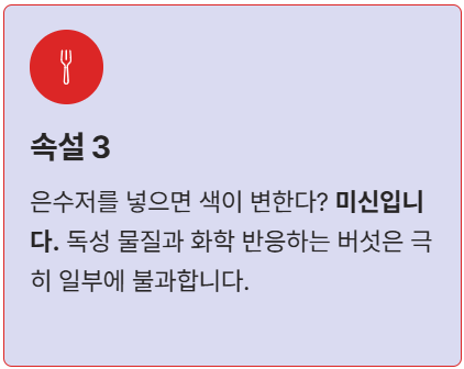 - **속설 3: 은수저를 넣으면 색이 변한다?** → 독성 물질과 화학 반응을 일으키는 버섯은 극히 일부에 불과합니다.