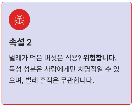 - **속설 2: 벌레나 곤충이 먹은 버섯은 식용이다?** → 버섯의 독성 성분은 사람에게만 치명적일 수 있습니다. 벌레가 먹은 흔적은 식용 여부와 무관합니다.