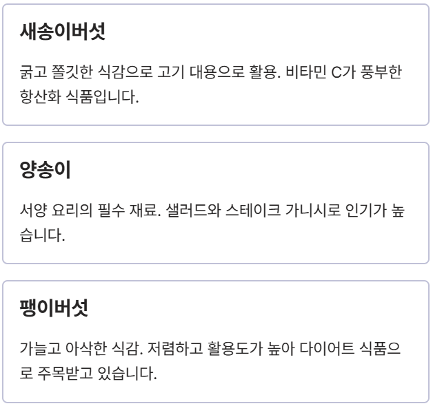 | **느타리버섯** | 부채 모양, 부드러움 | **식이섬유** 다량, **저칼로리** | 찌개, 전골, 볶음 |
