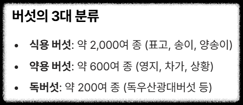 버섯은 식물이 아닌 균류(Fungi)의 자실체(열매)입니다. 전 세계적으로 알려진 버섯은 약 1만 종이 넘으며, 이 중 **식용 버섯**은 약 2,000여 종, 약용으로 쓰이는 **약용 버섯**은 600여 종, 그리고 치명적인 **독버섯**은 약 200여 종에 달합니다.
