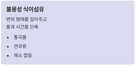| 불용성 | 변의 형태를 잡아주고 통과 시간을 단축 (통곡물 등) |