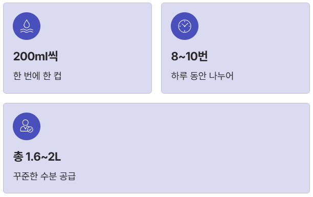 💧 수분 섭취 Tip: 한꺼번에 마시지 말고, 200ml씩 하루 8~10번 나누어 마시기!
