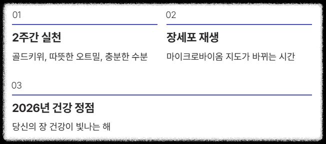 변비 치료는 단거리 경주가 아니라 마라톤입니다. 오늘 소개한 골드키위, 따뜻한 오트밀, 충분한 수분 섭취를 2주만 실천해 보세요. 우리 몸의 장세포가 재생되고 마이크로바이옴 지도가 바뀌는 데 걸리는 최소한의 시간입니다. 2026년은 당신의 장 건강이 정점을 찍는 해가 되길 바랍니다!