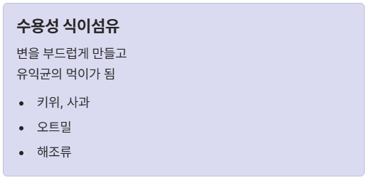 | 수용성 | 변을 부드럽게 만들고 유익균의 먹이가 됨 (키위, 사과 등) |