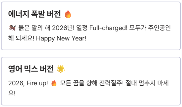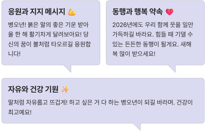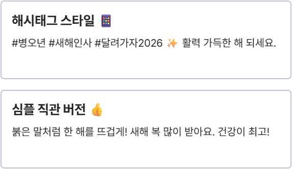 지금 바로 소개된 문구 중 가장 마음에 드는 것을 골라 진심을 담아 전해보세요! 우리의 2026년이 붉은말처럼 활활 빛나기를 바라며!😊