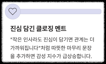 - **3. 진심을 담은 클로징:** 마지막에 "작은 인사라도 진심이 담기면 관계는 더 가까워집니다."와 같은 감성적인 클로징 멘트를 추가하여 따뜻함을 더하세요.